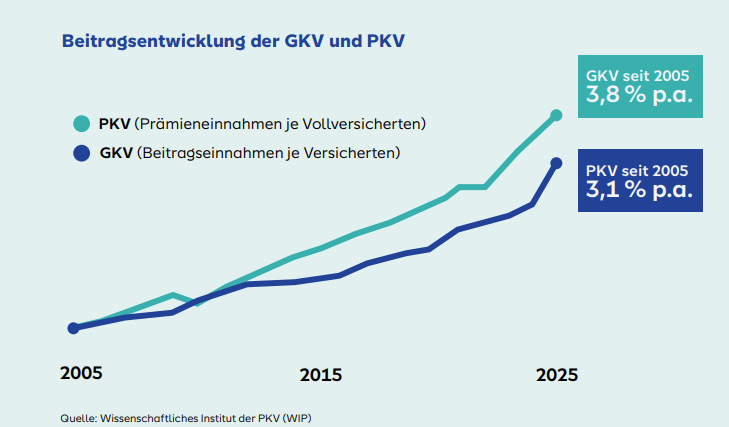 Langfristige Vergleiche zeigen, dass die Beitragsentwicklung in beiden Systemen sehr ähnlich verläuft, wobei die GKV tendenziell etwas höhere jährliche Raten aufweist.