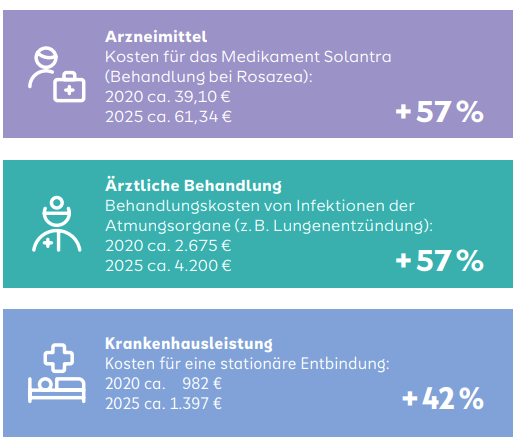 Die anhaltenden und teils drastischen Kostensteigerungen im Gesundheitswesen stellen sowohl die GKV als auch die PKV vor große Herausforderungen. Beispiele für Kostensteigerungen, die bei SIGNAL IDUNA identifiziert wurden: